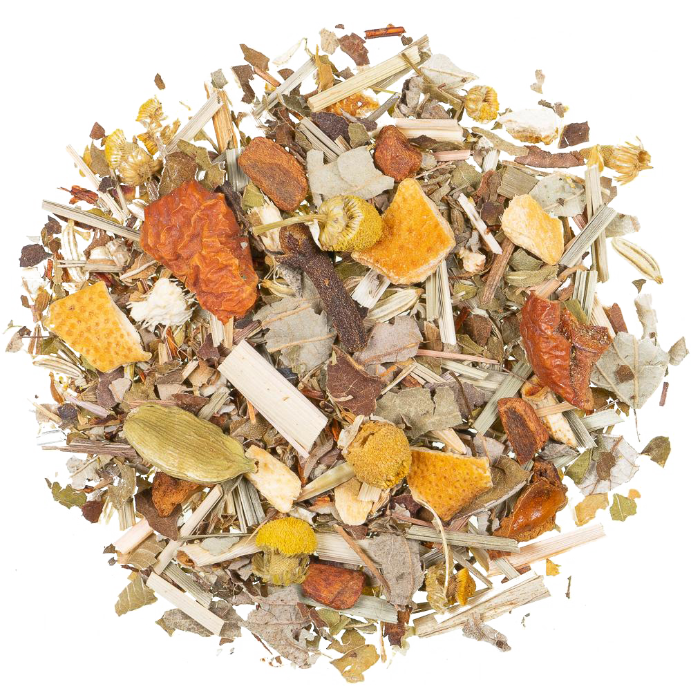 citroengras, braambesbladeren, venkel, rooibos, ijzerkruid, kamillebloesems, anijszaad, sinaasappelschillen (6%), stukjes appel (5%), kaneel, natuurlijke aroma’s, stukjes gember, kruidnagel, kardemom.