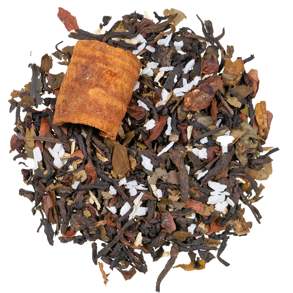 Pu Erh, zwarte thee, cacaoschilfers (12%), kokosschilfers, aroma’s, zoete braambesbladeren, kaneelstokjes, cacaobonen (5%), guayusa (4%).