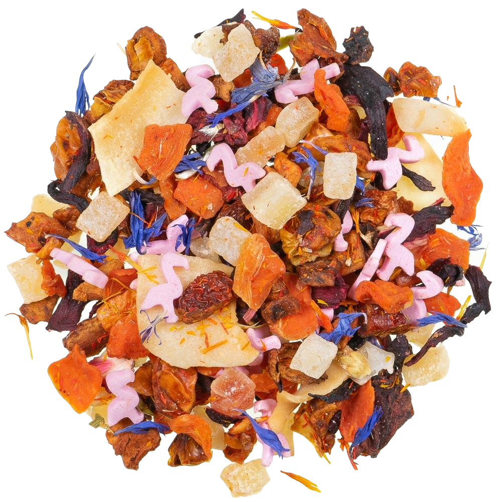 stukjes appel (appel, zuurvormer, citroenzuur), gekonfijte stukjes papaya (papaya, suiker), stukjes wortel, roze flamingohagelslag (suiker, rijstmeel, cacaoboter, verdikkingsmiddel: tragacant, kleurstoffen (bietensapconcentraat)) (8%), hibiscusbloesems, gekonfijte stukjes mango (mango, suiker), natuurlijke aroma’s, stukjes rode biet, kokosschilfers (kokosnoot, suiker), saffloerbloesems, korenbloembloesems.