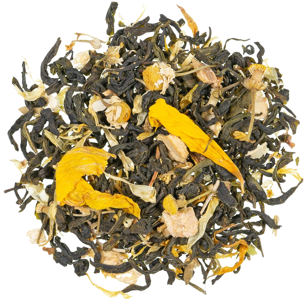 groene China Wu Lu, stukjes gember, natuurlijke aroma's, kamillebloesems (4%), lindebloesems (2%), vlierbloesems (2%), goudsbloembloesems (1%), zonnebloembloesems (1%).