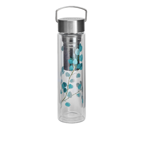 Glazen theethermos met dubbele wand. Kan gebruikt worden voor zowel koude als warme dranken. Inclusief theefilter en deksel in roestvrij staal en neopreen hoesje met draagriem.