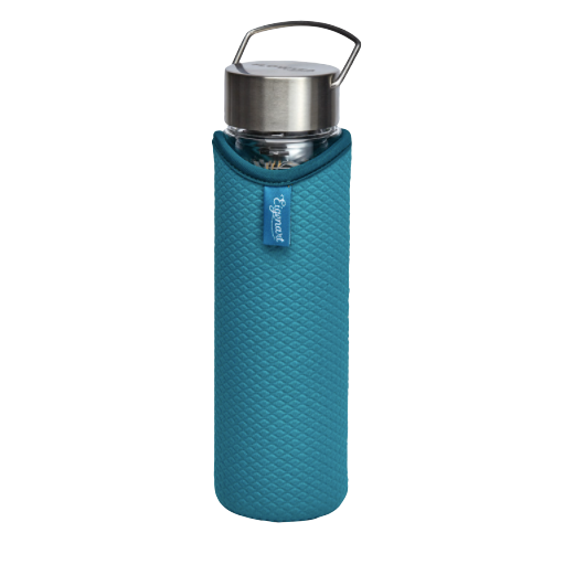 Glazen theethermos met dubbele wand. Kan gebruikt worden voor zowel koude als warme dranken. Inclusief theefilter en deksel in roestvrij staal en neopreen hoesje met draagriem.