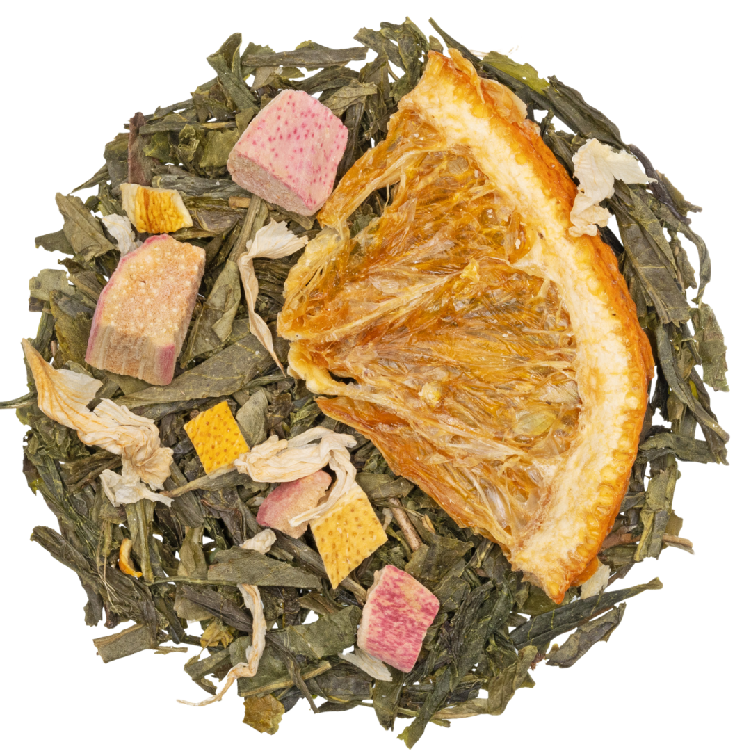 groene thee, sinaasappelschillen, aroma, citroenschillen, witte hibiscusbloesems, stukjes rabarber(1%)