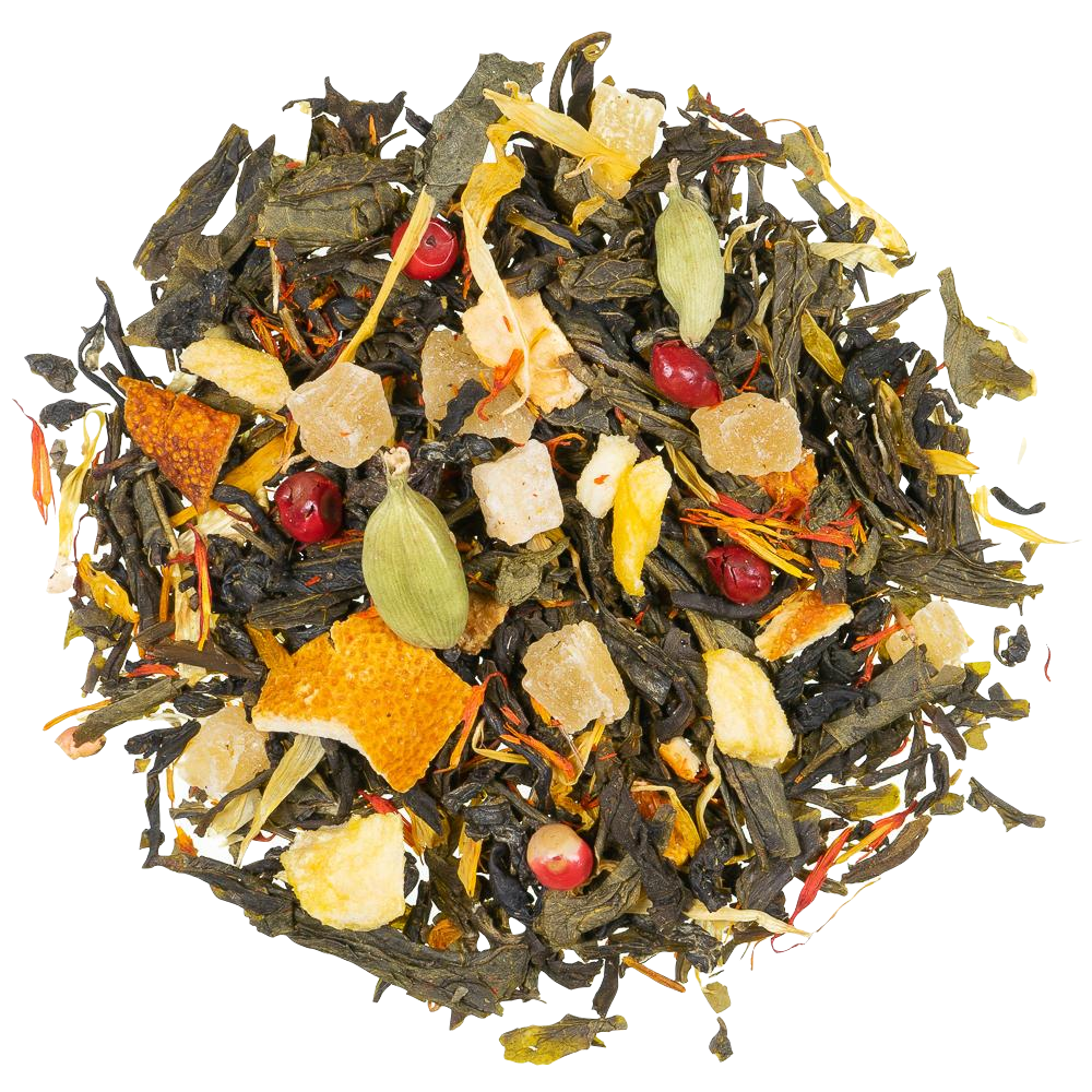 groene China Sencha, gekonfijte stukjes ananas (ananas, suiker), sinaasappelschillen, natuurlijke aroma’s, kardemom (1%), saffloerbloesems, goudsbloembloesems, roze peper, stukjes abrikoos (0,5%).