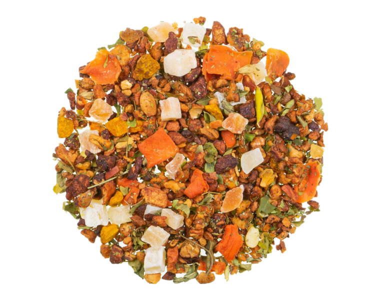 stukjes appel (appel, zuurteregelaar: citroenzuur), gekonfijte mangostukjes (mango, suiker) (10%), gekonfijte papaja stukjes (papaja, suiker), stukjes wortel, moringabladeren, kurkuma, natuurlijk aroma, steviabladeren