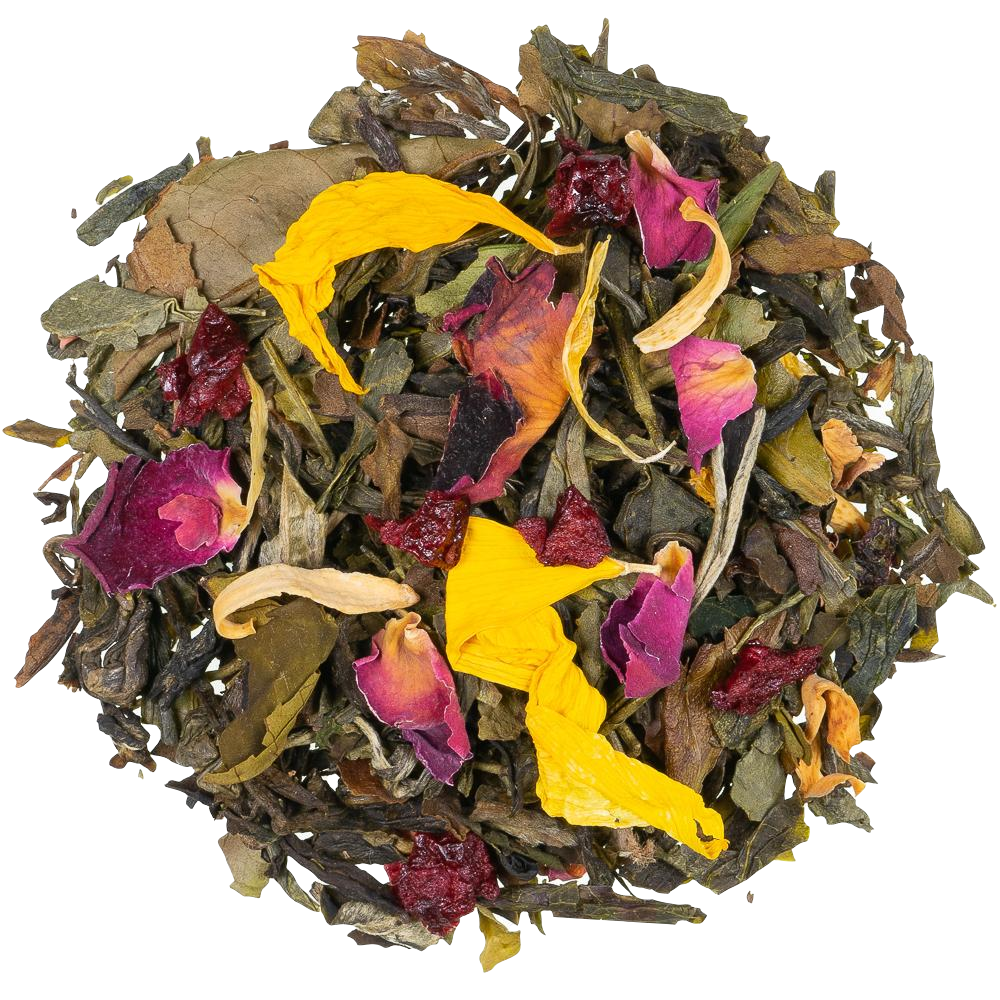 witte China Pai Mu Tan, groene China Fog Tea, -Lung Ching, jasmine jade pearls (0,9%), aroma’s, rozenbloesembladeren, stukjes zure kers, sinaasappelbloesems, zonnebloembloesems.