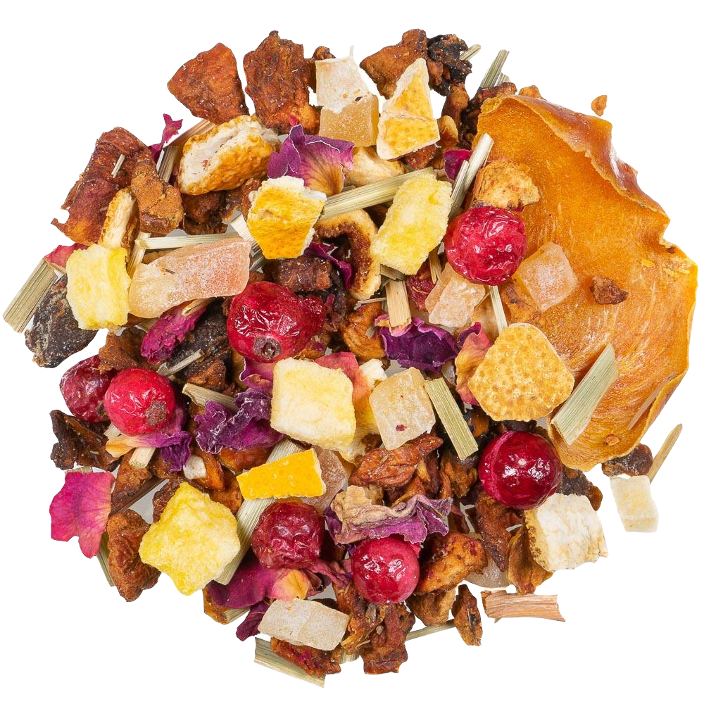 stukjes appel (appel, zuurteregelaar: citroenzuur), stukjes papaja (papaja, suiker), sinaasappelschil, schijfjes kaki (10%), aroma, citroengras, stukjes perzik (perzik, rijstmeel) (4%), rode bessen, rozenblaadjes.