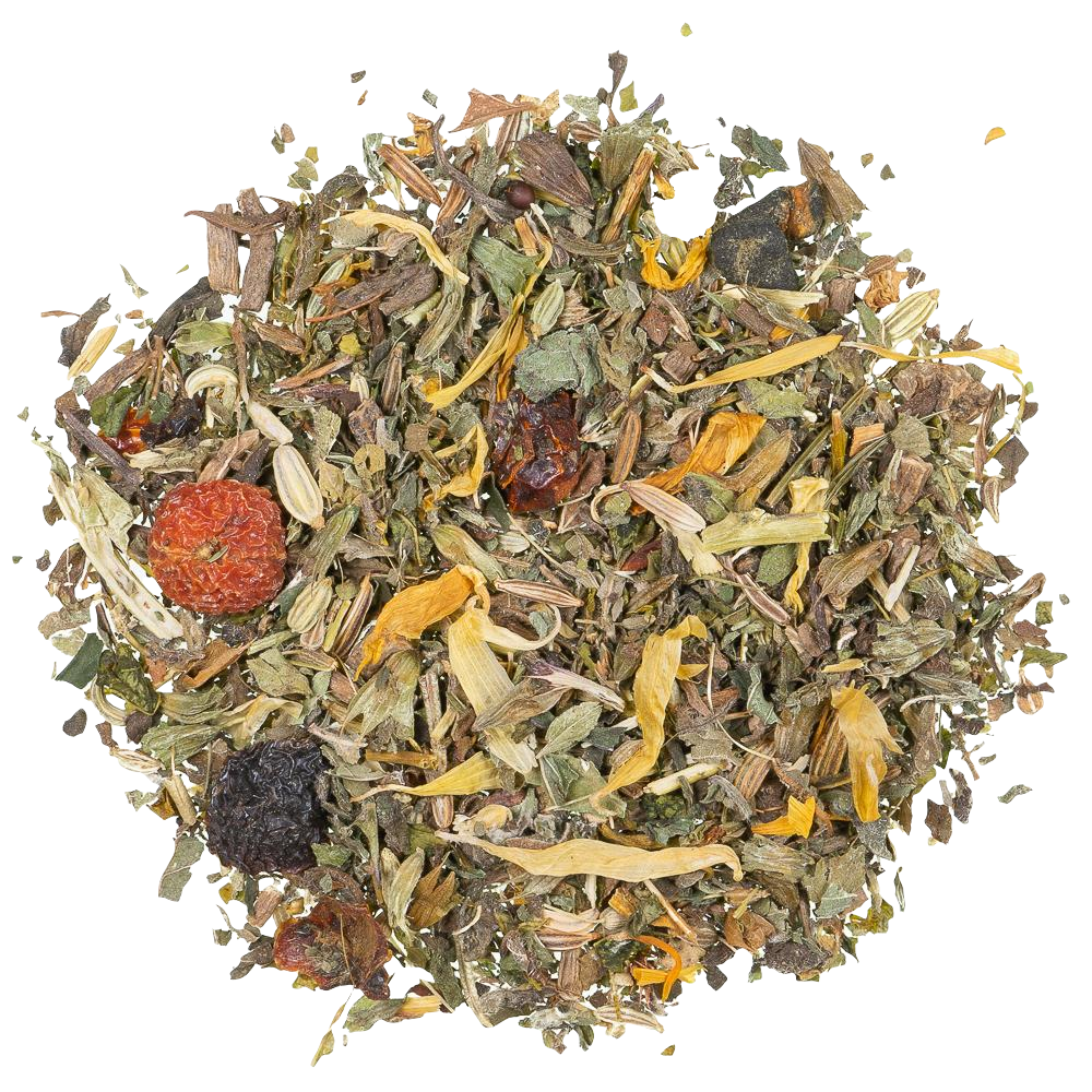 valeriaanwortel, passiebloemkruid, citroenmelissebladeren (15%), pepermunt, venkel, karwij, anijs, rozenbottelschillen, rozemarijn, goudsbloembloesems.