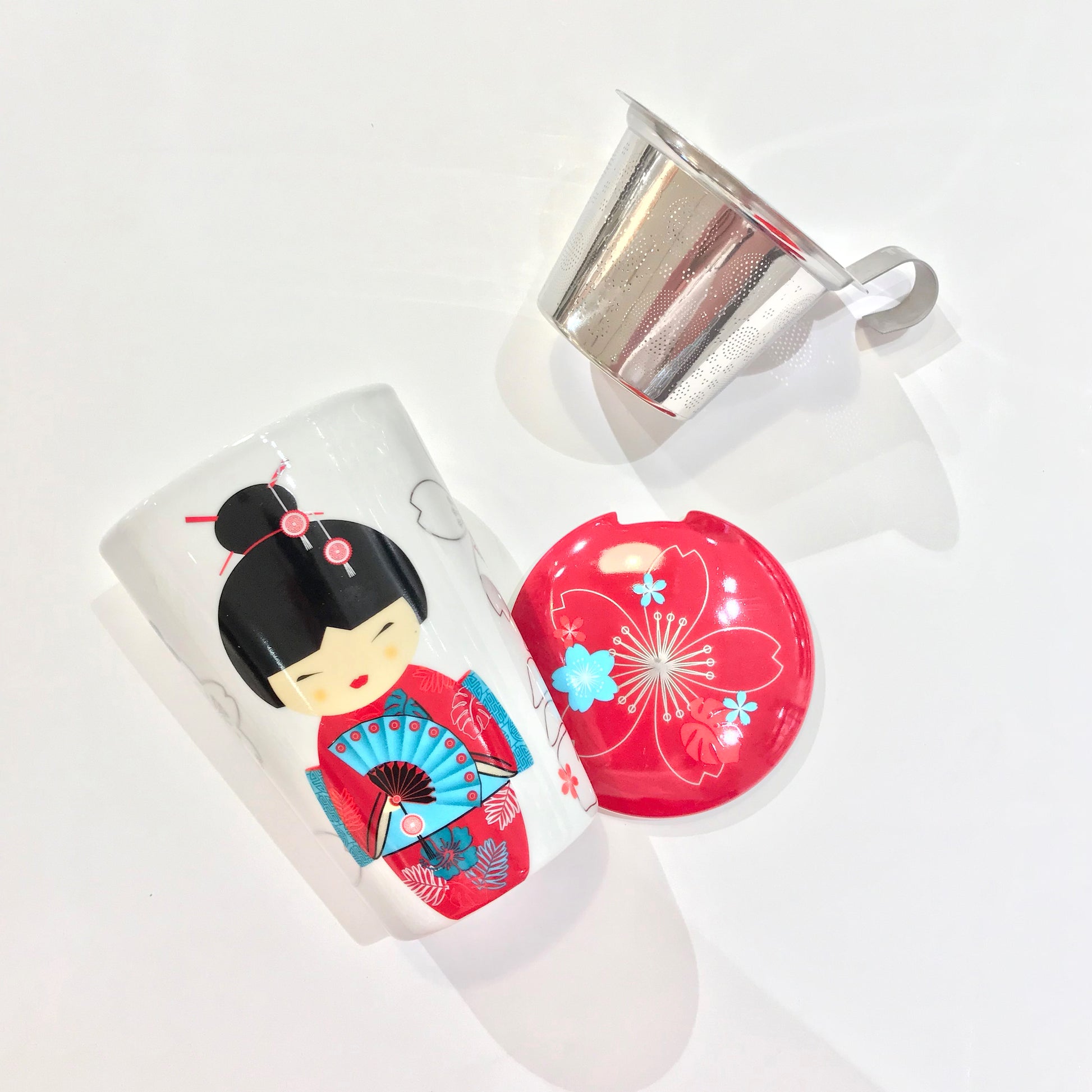 Porseleinen mok en deksel met filter in roestvrij staal.