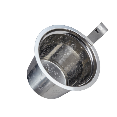 Porseleinen mok en deksel met filter in roestvrij staal.